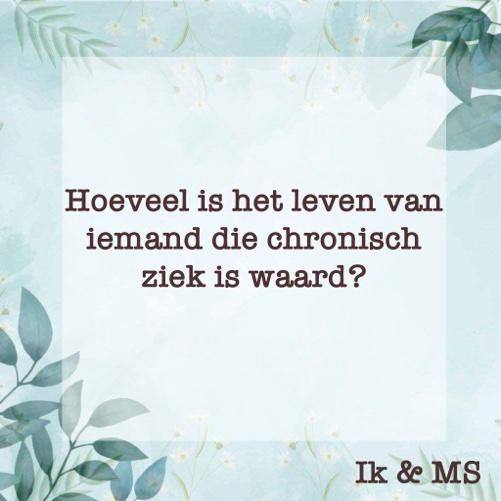 Hoeveel is het leven van iemand die chronisch ziek is waard? Hoeveel is mijn leven waard? Ik heb namelijk maar MS. Daar ga je niet direct dood aan. Ik ben tenslotte ook nog jong. Toch heb ik ernstige bijwerkingen van de MS medicatie en ben ik er daardoor net zo slecht aantoe als iemand die chemotherapie krijgt. Alleen heb ik het idee dat sommige professionals er laconiek mee omgaan. Het zal namelijk allemaal wel meevallen. Je bent jong en zo ziek lijk je niet.