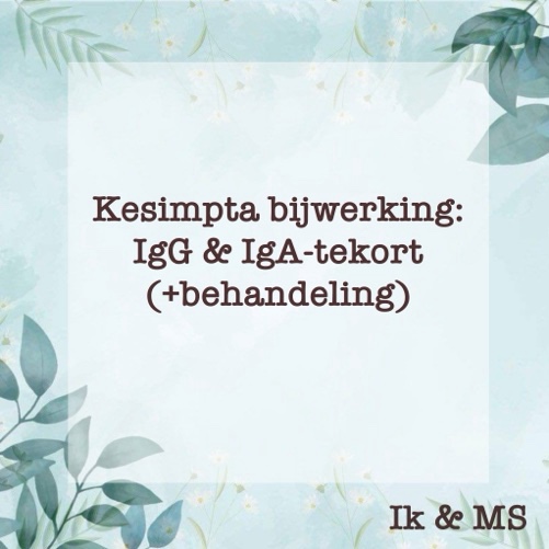 In mijn eerdere blog over Mijn ervaring met  Kesimpta heb ik het al een beetje laten doorschemeren dat ik een bijwerking had van deze medicatie (die eigenlijk al ontstaan is tijdens het gebruik van Ocrevus), namelijk een IgG en IgA-tekort. In deze blog zal ik jullie hier meer over vertellen; wat zijn IgG en IgA, wat zijn de gevolgen van een tekort en welke behandeling is hiervoor beschikbaar.