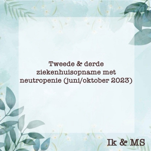 In een eerdere blog heb ik jullie verteld dat ik in augustus 2022 voor de eerste keer in het ziekenhuis belandde met neutropenie. Er is toen niet onderzocht waardoor de neutropenie was ontstaan. Ik ben daarom gewoon door gegaan met de Ocrelizumab. In december 2022 heb ik mijn tweede hele gift gehad en in juni 2023 mijn derde hele gift. Hoewel ik ook zelf niet echt meer aan de neutropenie had gedacht , was het nog niet weg en kwam ik in juni & oktober 2023 weer in het ziekenhuis terecht.